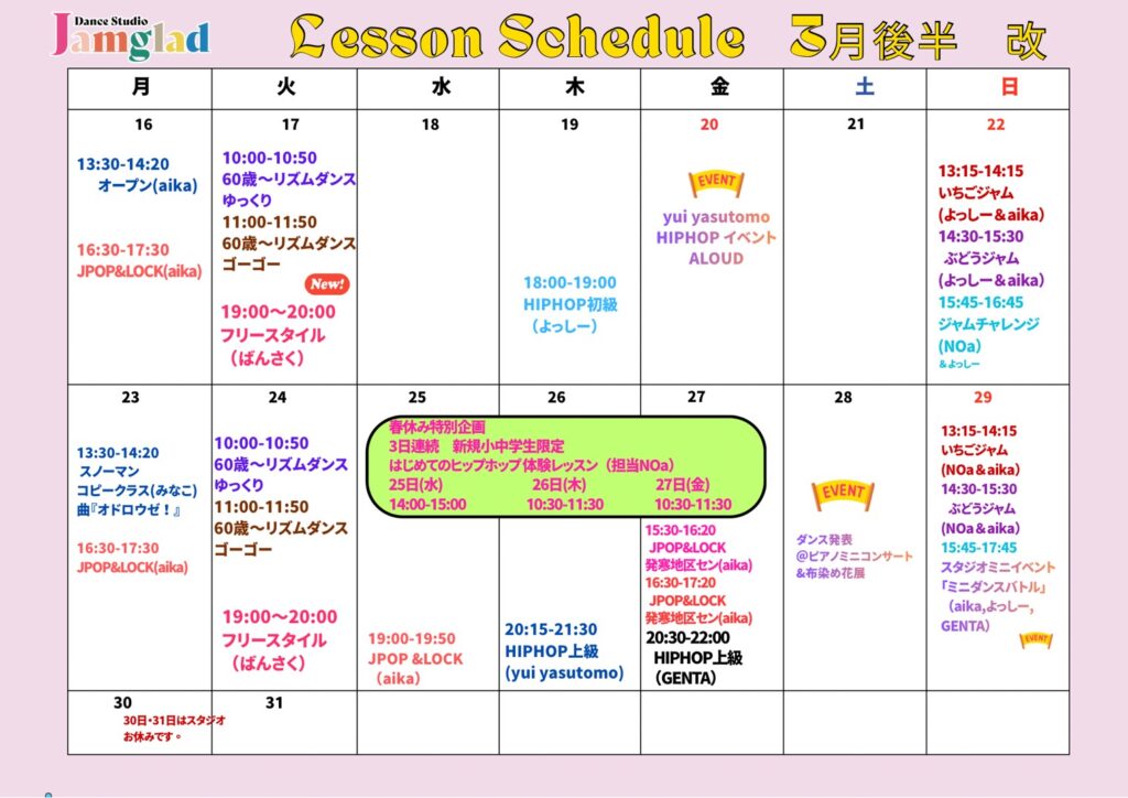 Dance Studio Jamglad 3月のレッスンスケジュールを公開しました✨